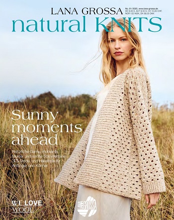 В новом журнале Natural Knits № 1 представлена летняя коллекция из 35 моделей, связанных эффектными узорами спицами и крючком из натуральной пряжи нежных оттенков. Журнал разделен на три темы: Навстречу солнцу: сетчатые структуры и бретонские полосы навевают мысли о море. Их сопровождают успокаивающие оттенки синего или бежевого, а еще новая палитра нежной пастели, слегка размытой - словно в лучах солнца.